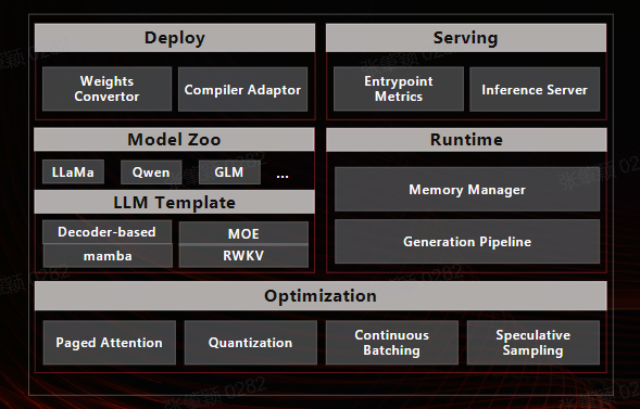• 编译阶段:支持权重转换、量化预处理、Tensor并行处理超大规模的权重等。