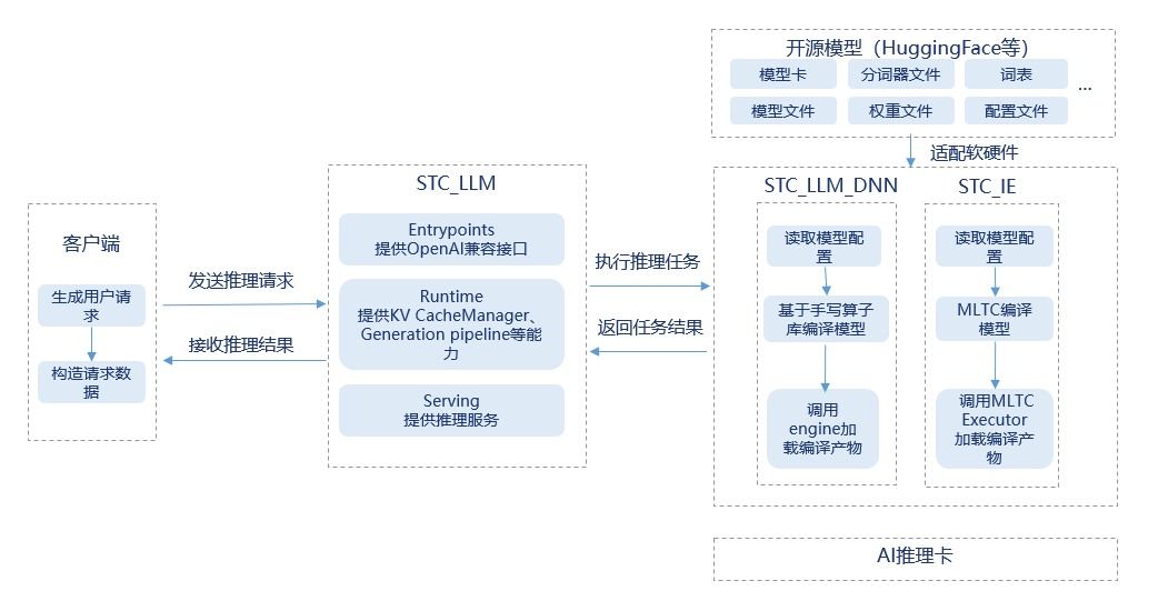 STC_LLM_DNN是大模型通过手写算子等特殊处理编译后部署LLM的框架。STC_IE是大模型通过MLTC编译器编译后部署LLM的框架。目前,采用STC_LLM_DNN框架进行编译部署的大模型,在推理环节展现出更优的性能表现。STC_LLM中封装了OpenAI风格的接口,服务端可以提供推理服务并处理推理请求,客户端通过Python脚本、curl命令等方式和LLM交互。