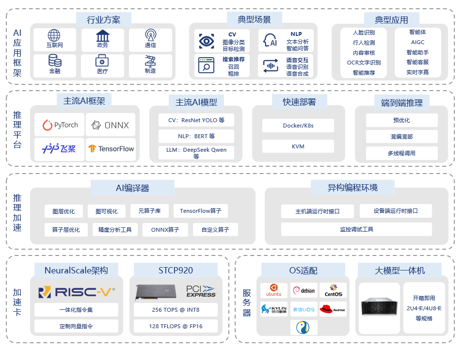 希姆计算STCP920 AI推理加速卡基于NeuralScale架构、软硬件协同设计,可以通过标准的PCIe接口便捷地集成到各类服务器中,从而快速扩展云端推理能力,满足计算机视觉、自然语言处理、语音识别、搜索推荐、LLM等主流AI场景中的推理加速需求。