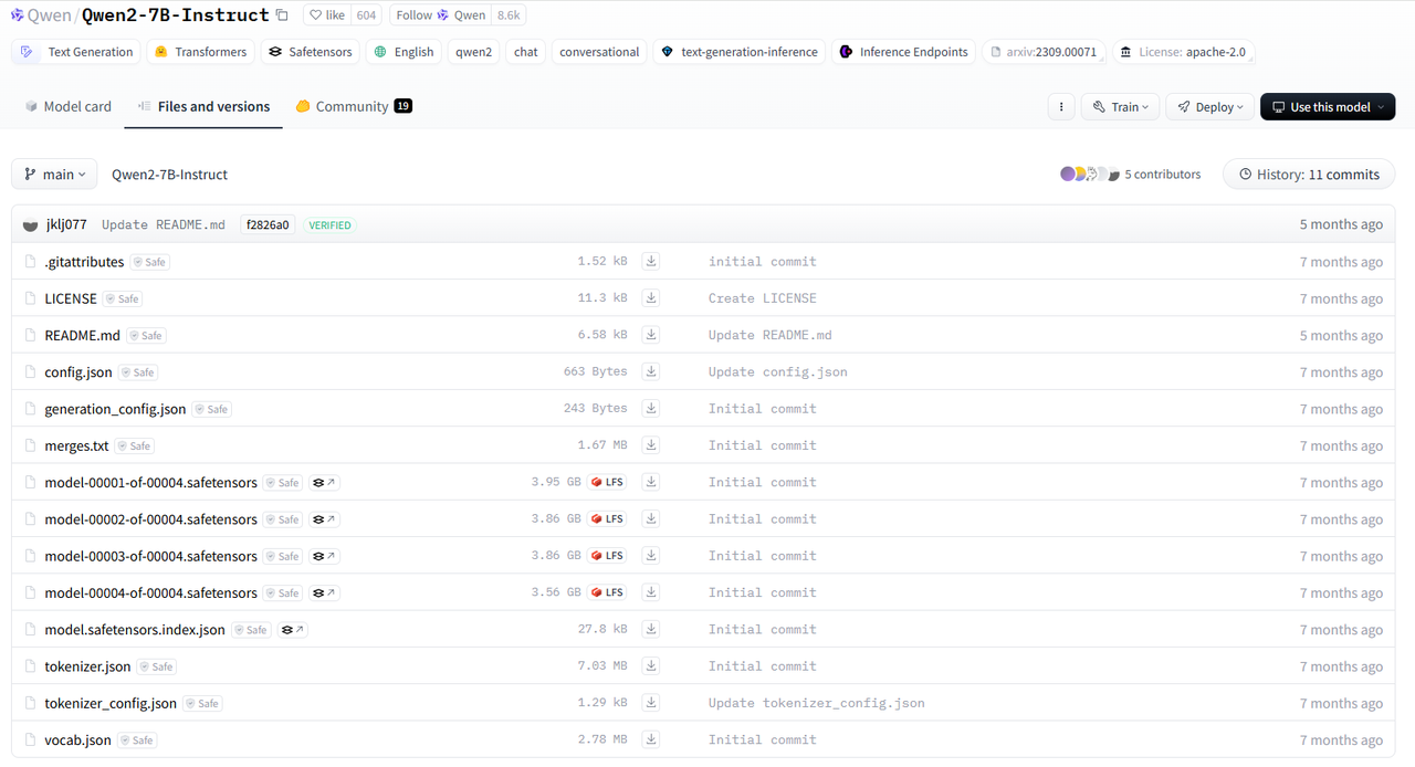 从HuggingFace等渠道获取Qwen2-7B-Instruct文件,包括模型文件、权重文件、分词器文件、词表等,并复制到目标服务器。